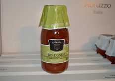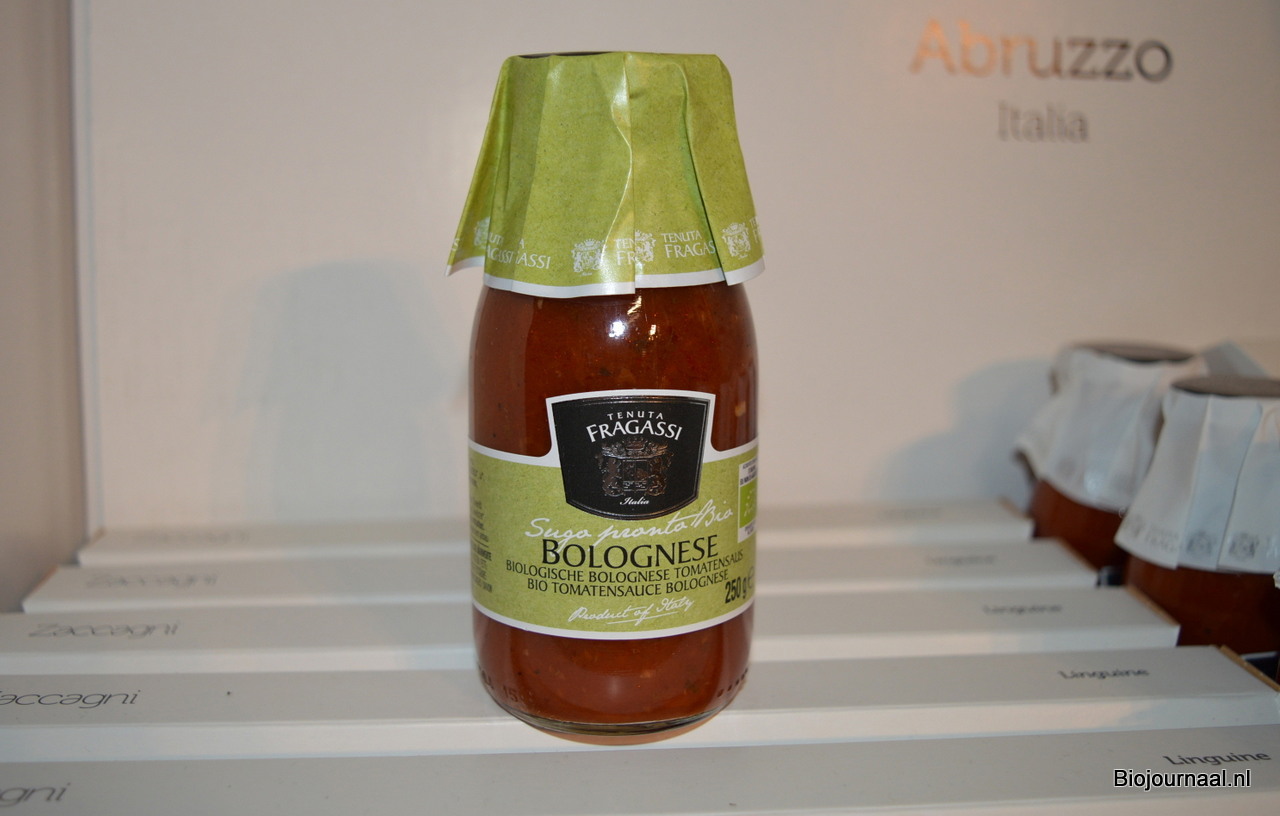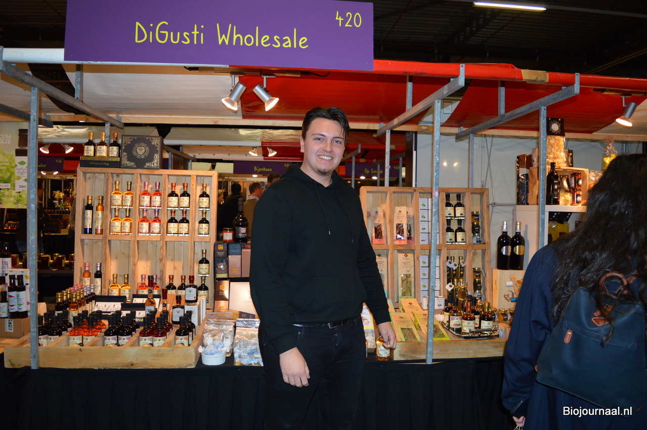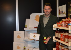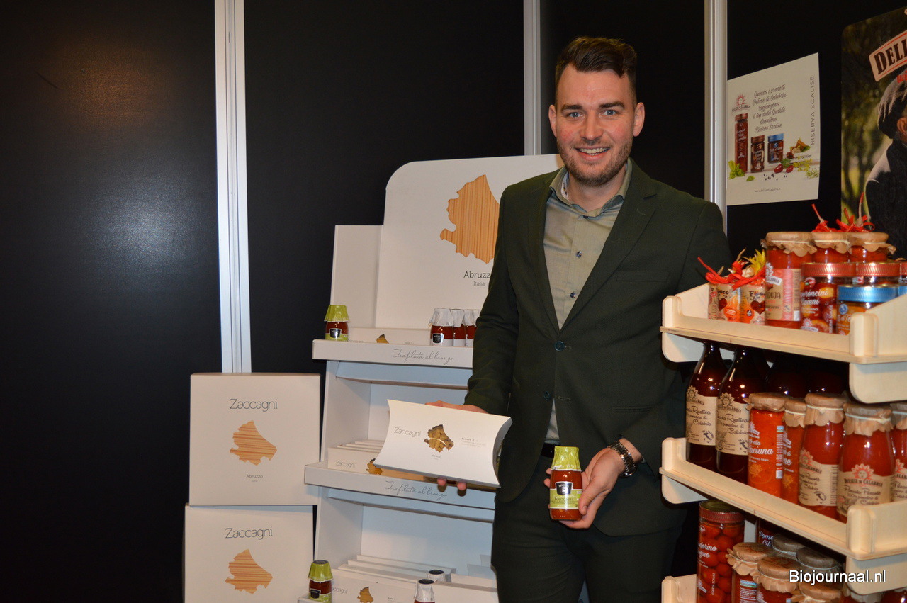Jasper Steenwinkel toont in de stand van GustoNL een biologische pastasaus.