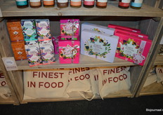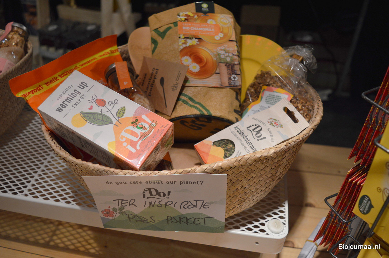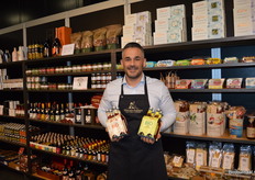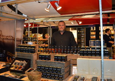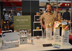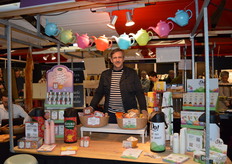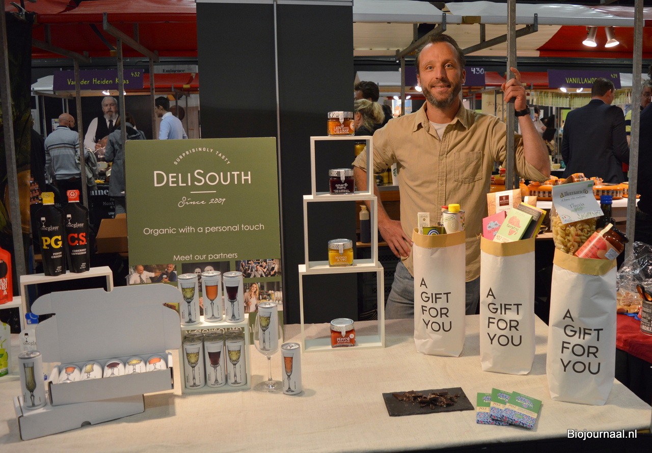 Frank Tillemans in de marktkraam van DeliSouth. Speciaal voor deze beurs had hij geschenkverpakkingen (rechts) bij.