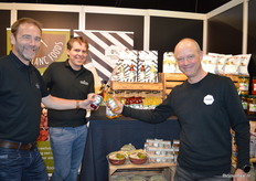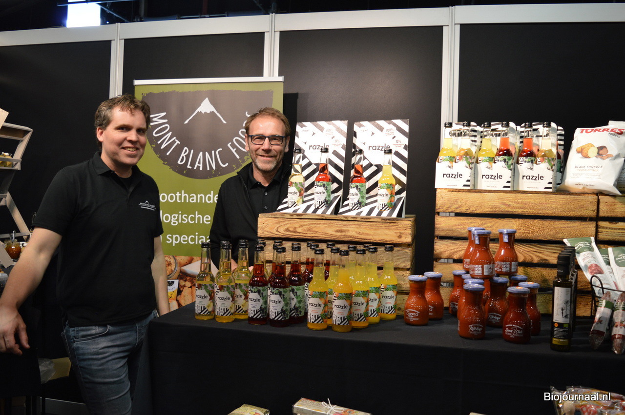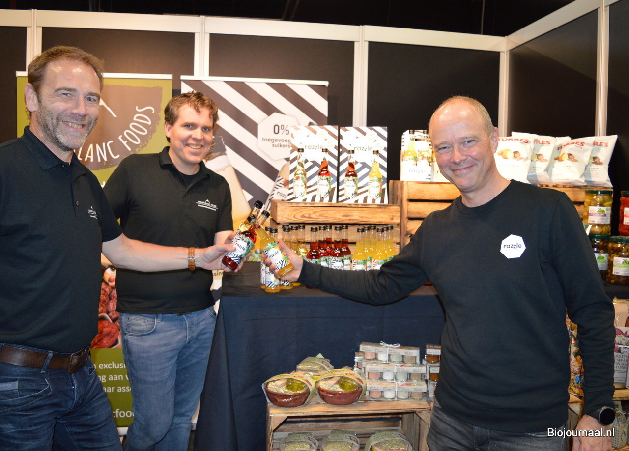 Leo den Hamer en Hans van der Velde kregen bij Mont Blanc Foods 's middags gezelschap van Alain de Bruyn van Razzle. Dit is het nieuwste merk in het aanbod van de groothandel in (biologische) delicatessen. De heren toasten op een succesvolle start van de samenwerking.