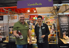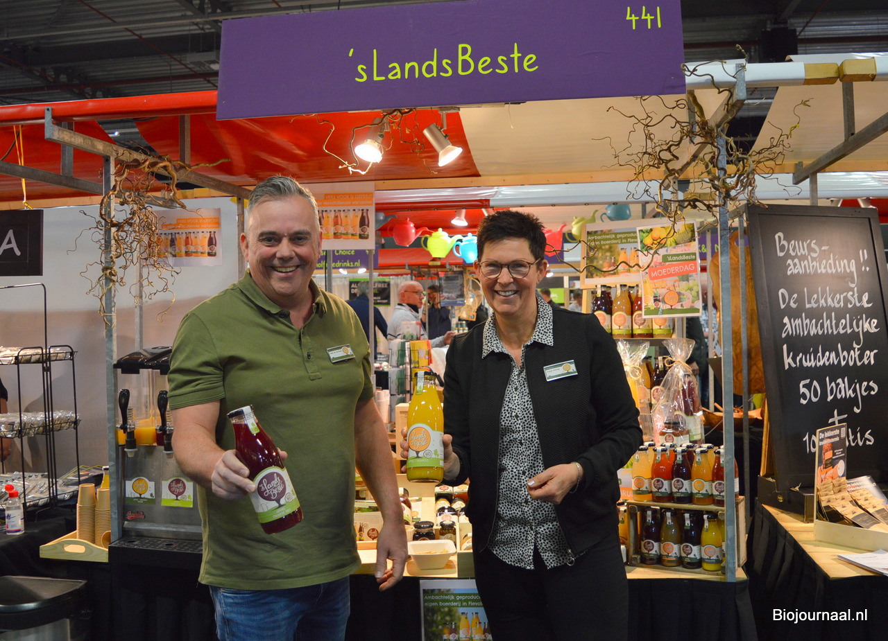 Cees Jan de Bruijn en Margo Baving tonen een paar bio-sappen van 's Lands Beste.