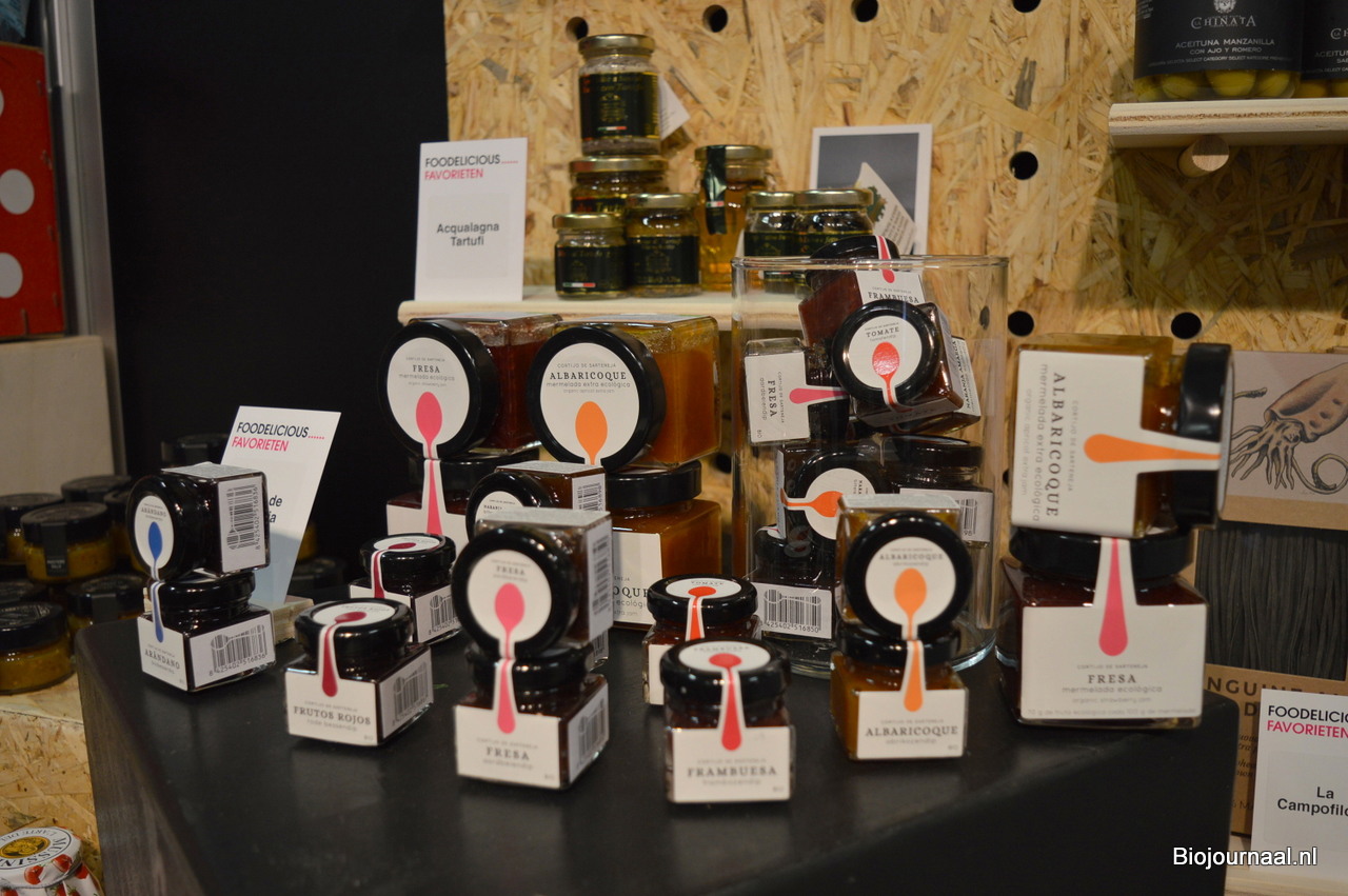 De biologische confituren van JanBax: abrikozen, aardbeien, frambozen.