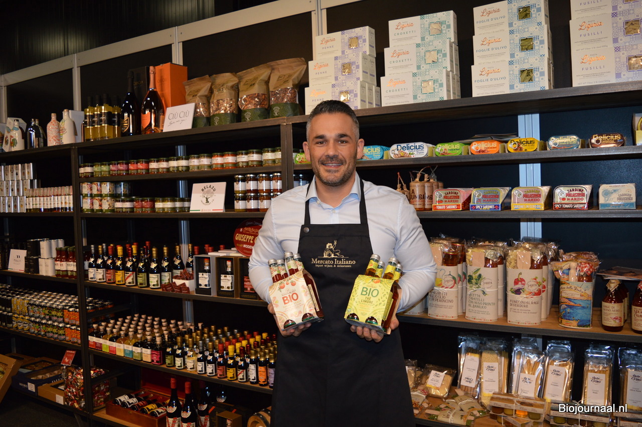Carlo Moro bij Mercato Italiano. Hij laat twee varianten van het Italiaanse bio-sap van Tomarchio zien. "Dit sap bevat pure vruchten en Etna water."